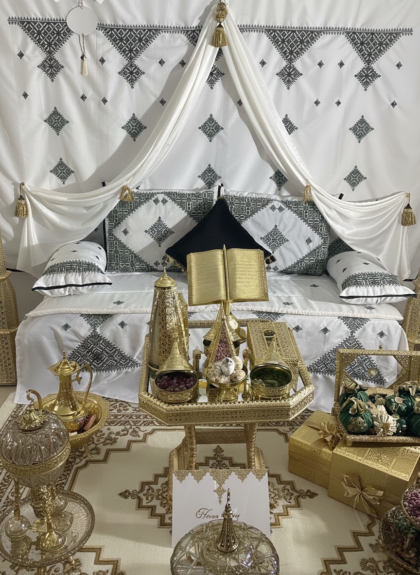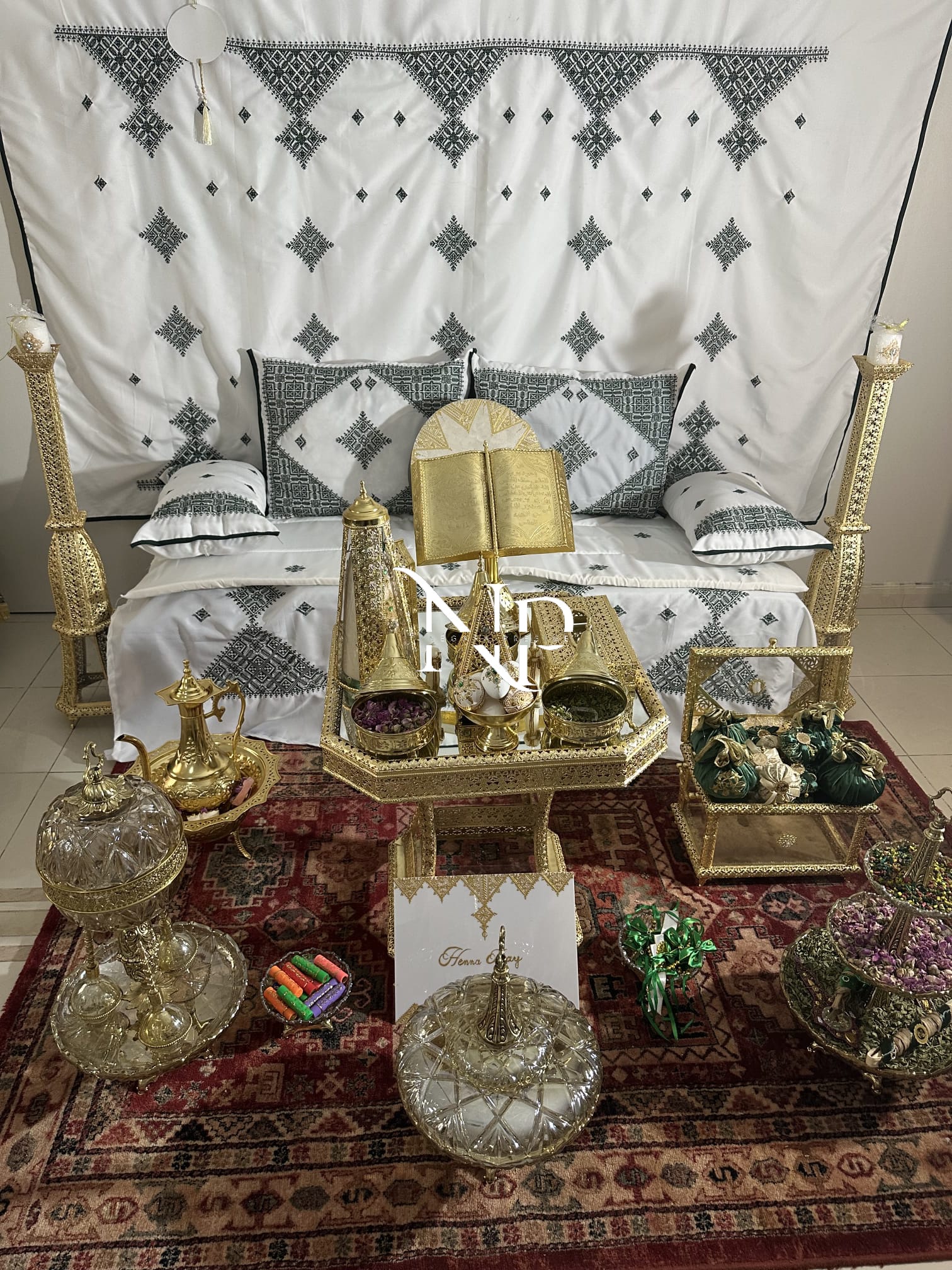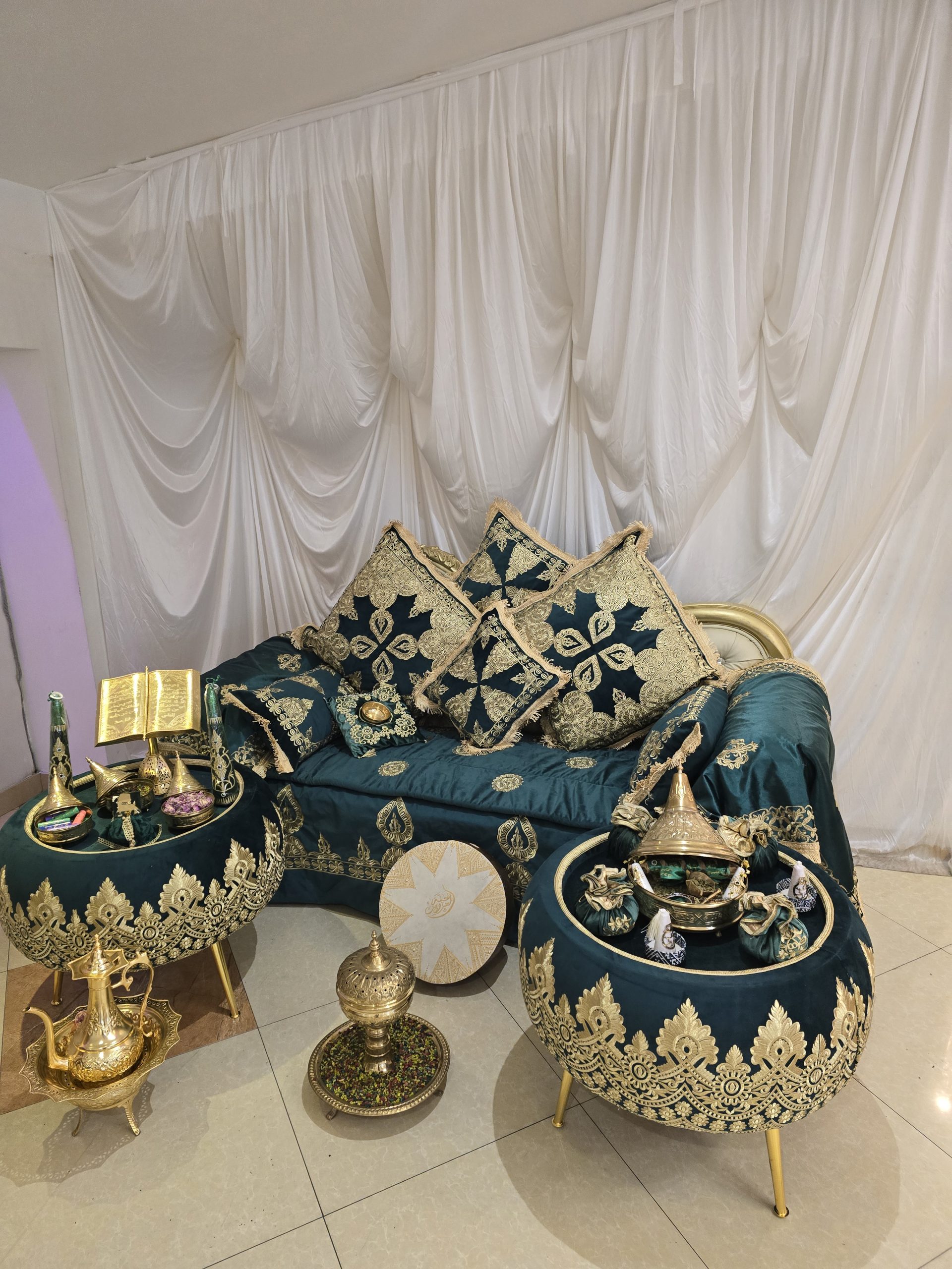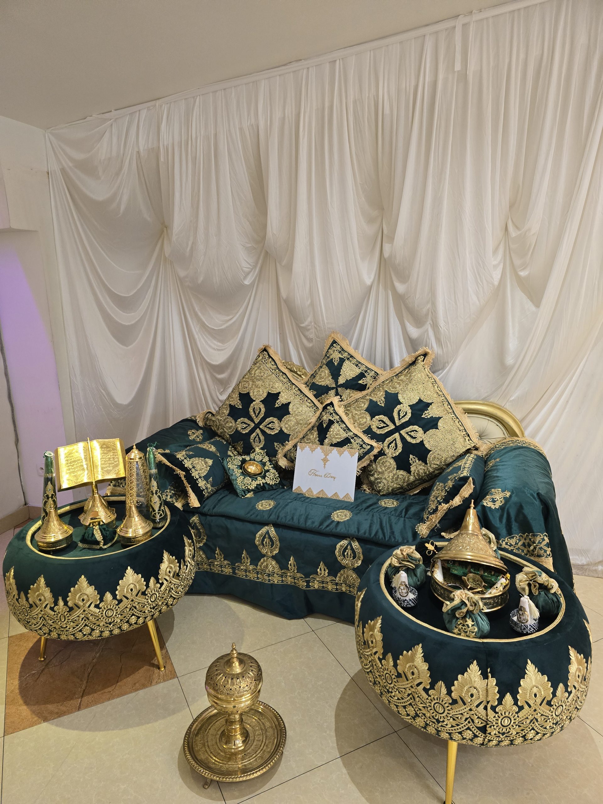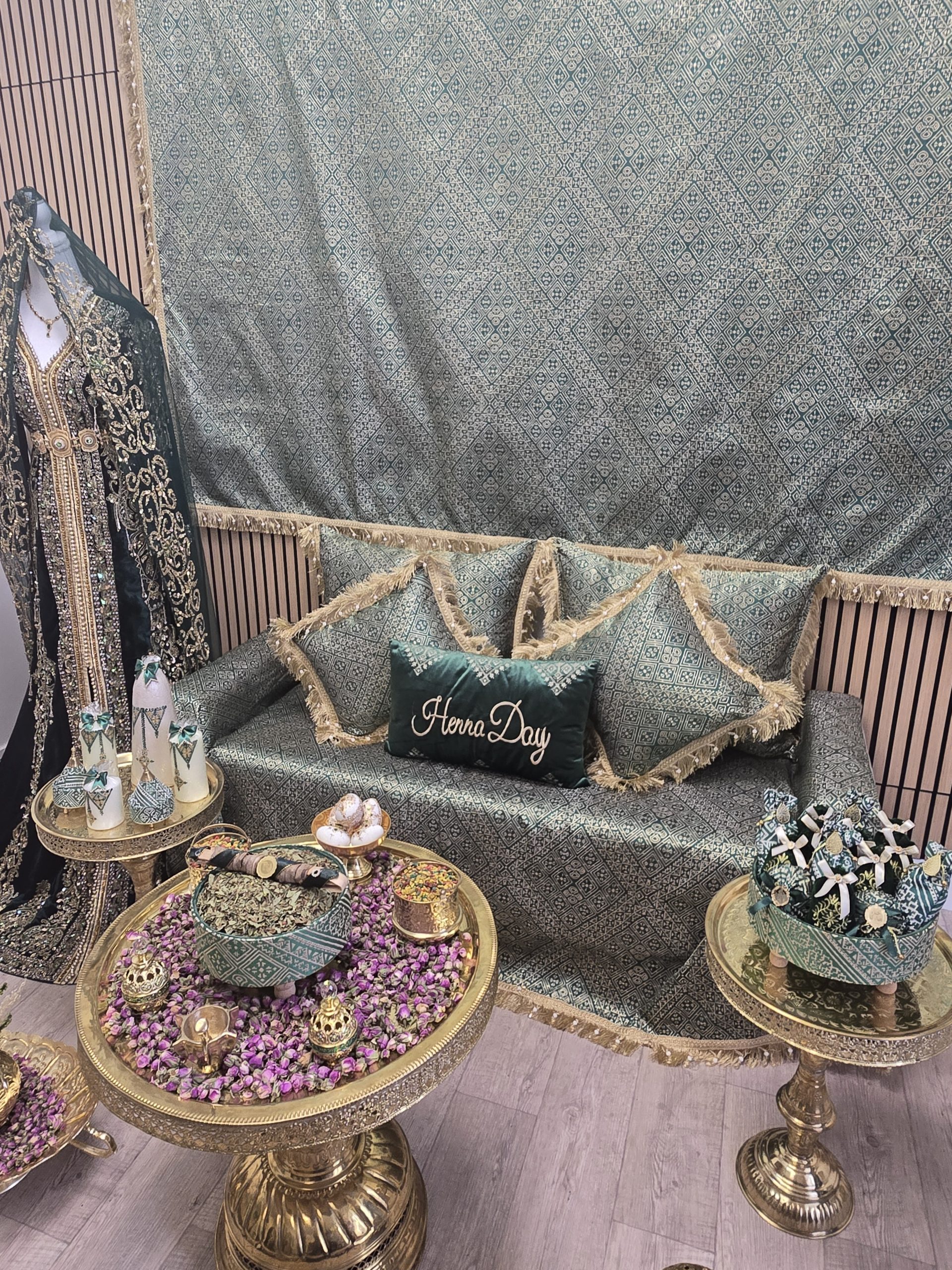 Idéale pour les cérémonies de henné, cette mise en scène est spécialement conçue pour offrir un cadre esthétique et confortable lors de la pose du henné (tatouage), tout en mettant en valeur ce rituel ancestral. Elle constitue également un décor parfait pour immortaliser ce moment à travers de magnifiques photos.