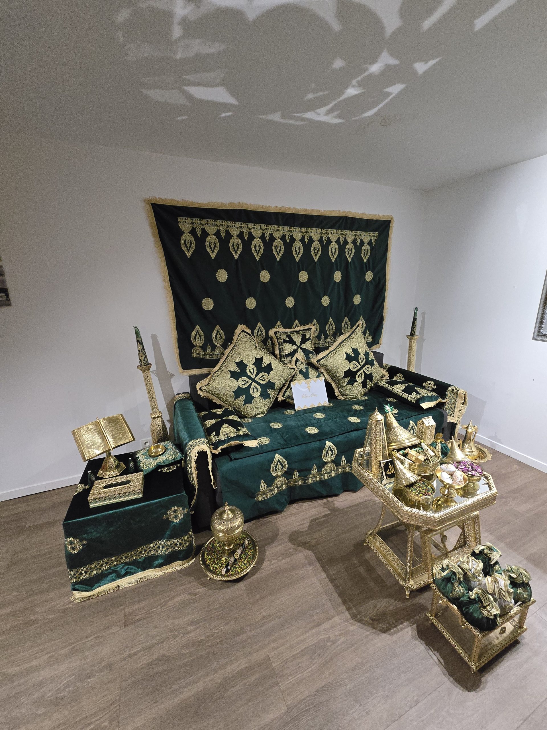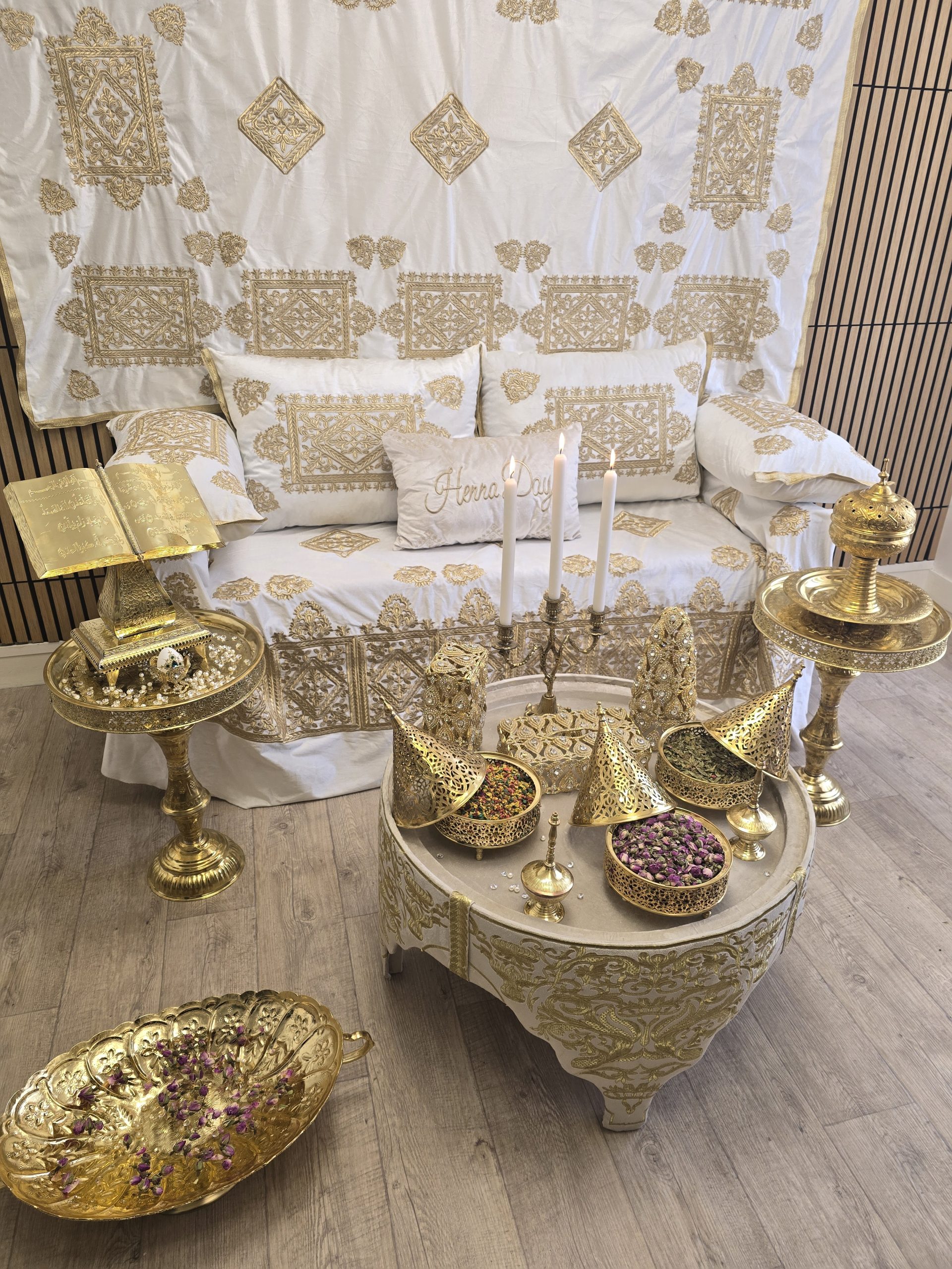 Réalisée avec un grand soin du détail, cette assise henné se compose d’un trône ou d’une assise élégante, de tapis raffinés, de coussins décoratifs, de lanternes traditionnelles et d’accessoires orientaux. Chaque élément est sélectionné pour créer une ambiance chaleureuse, intime et authentique, en harmonie avec les traditions du henné.
