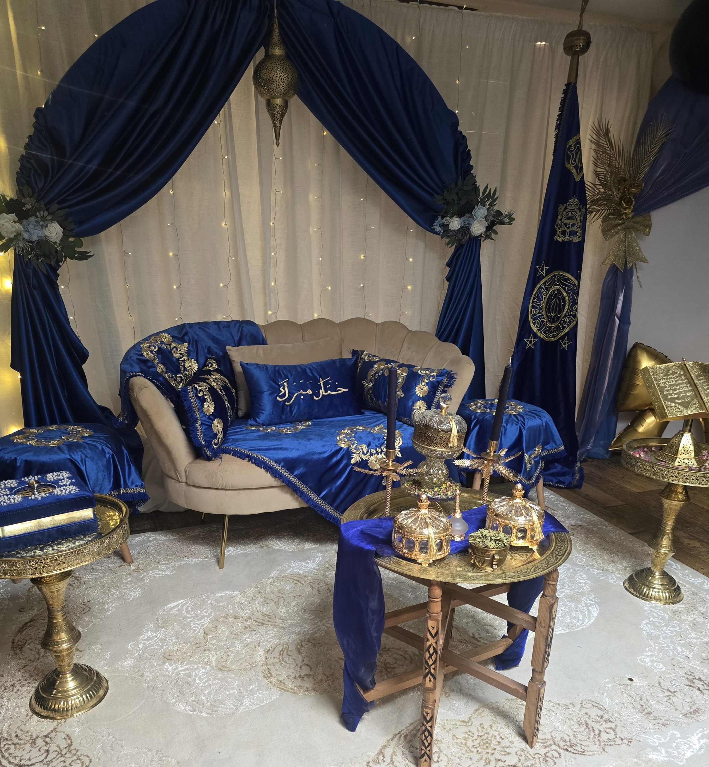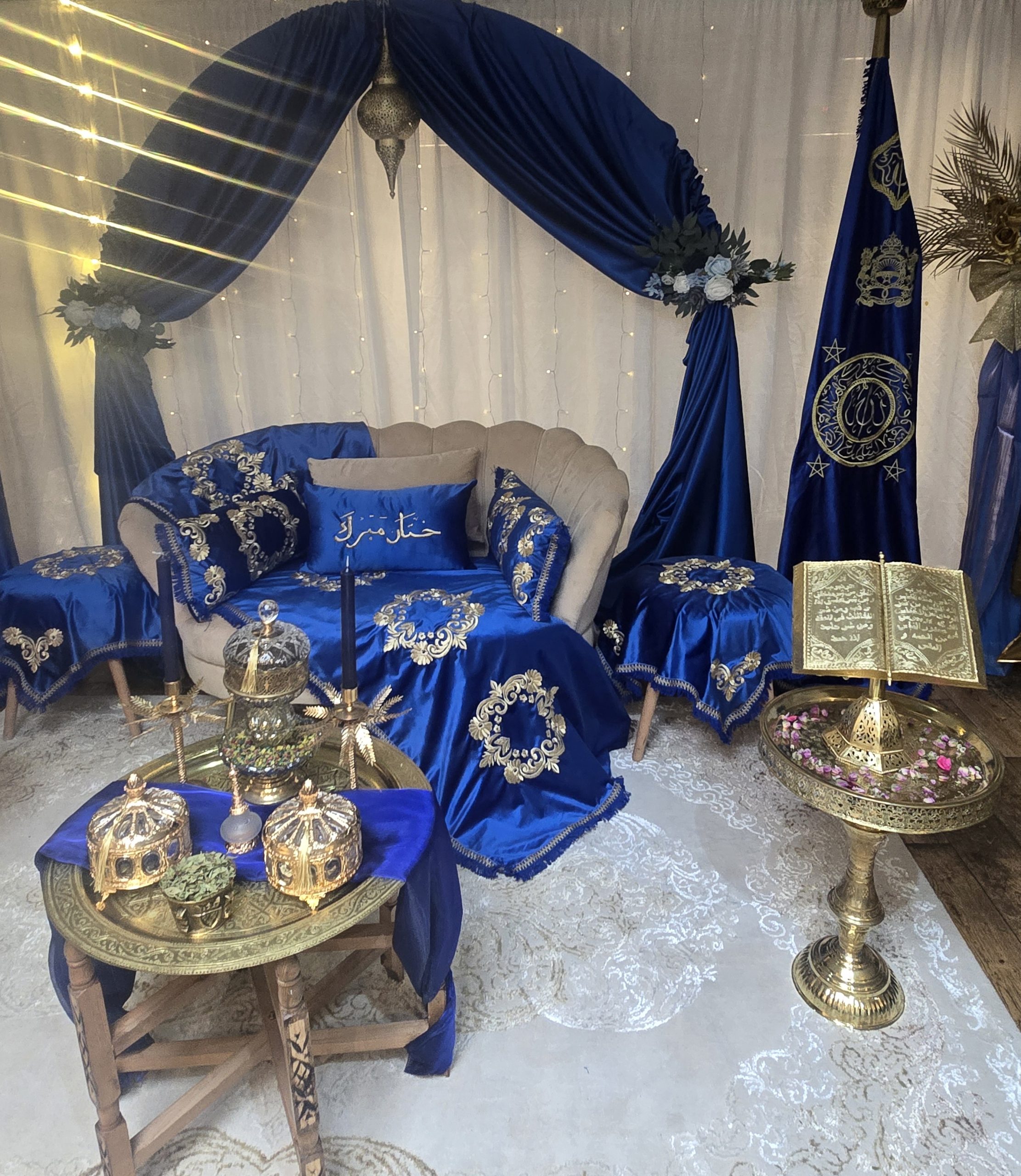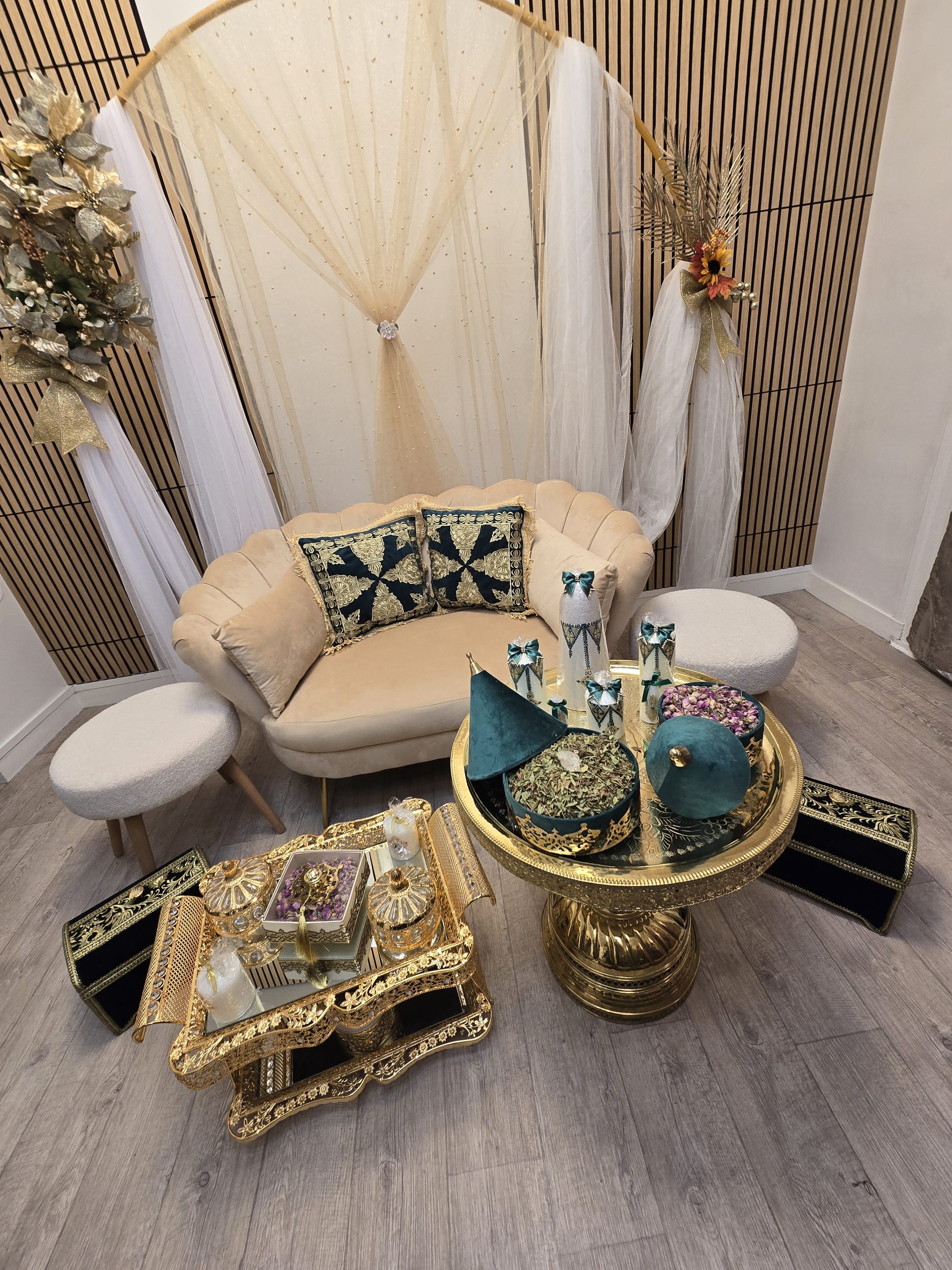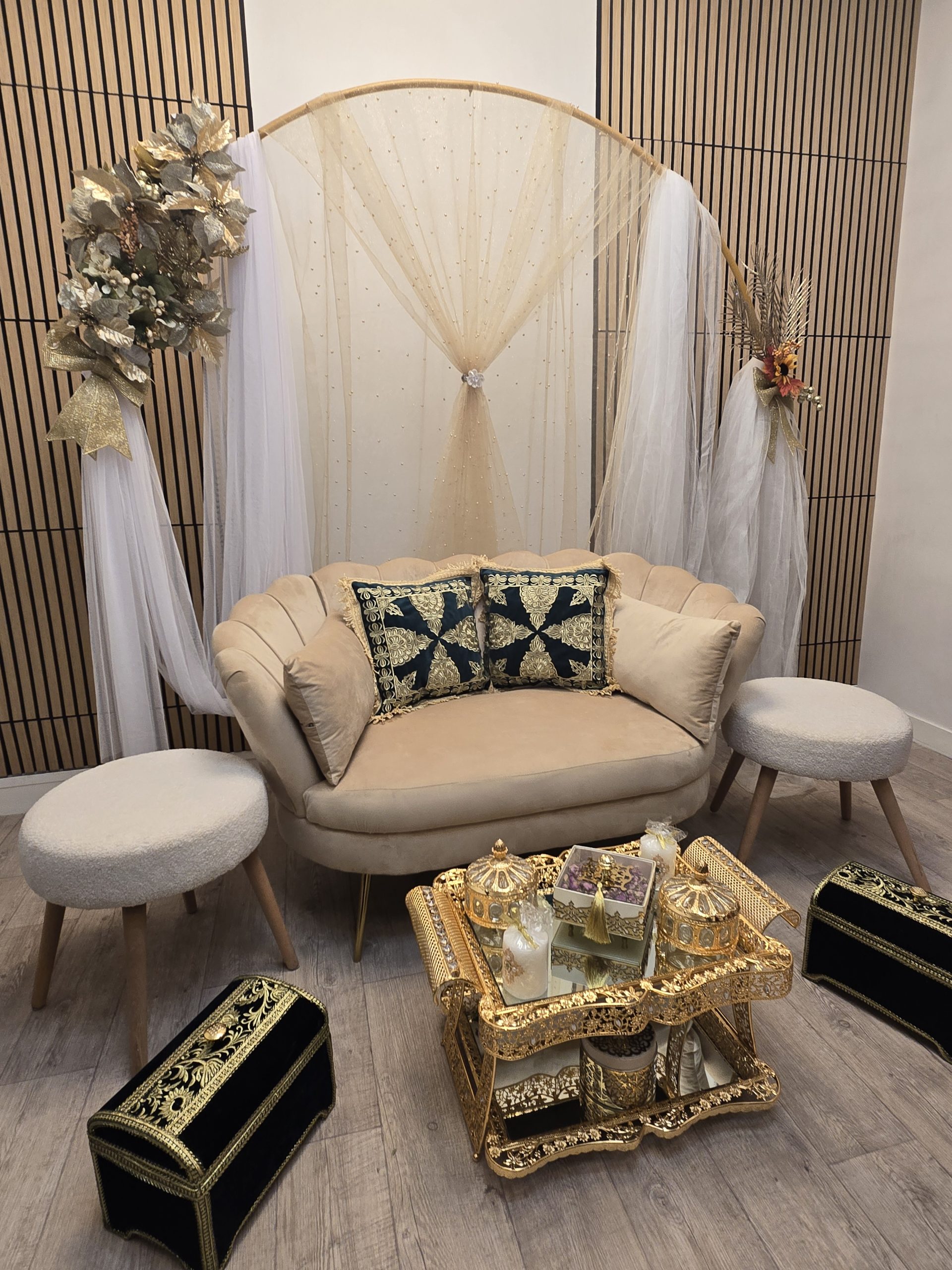 Idéal pour les mariages marocains traditionnels, ce coin est spécialement pensé pour offrir un cadre harmonieux et luxueux aux mariés, tout en mettant en valeur les rituels et les échanges symboliques. Il constitue également un décor parfait pour des photos de mariage inoubliables.