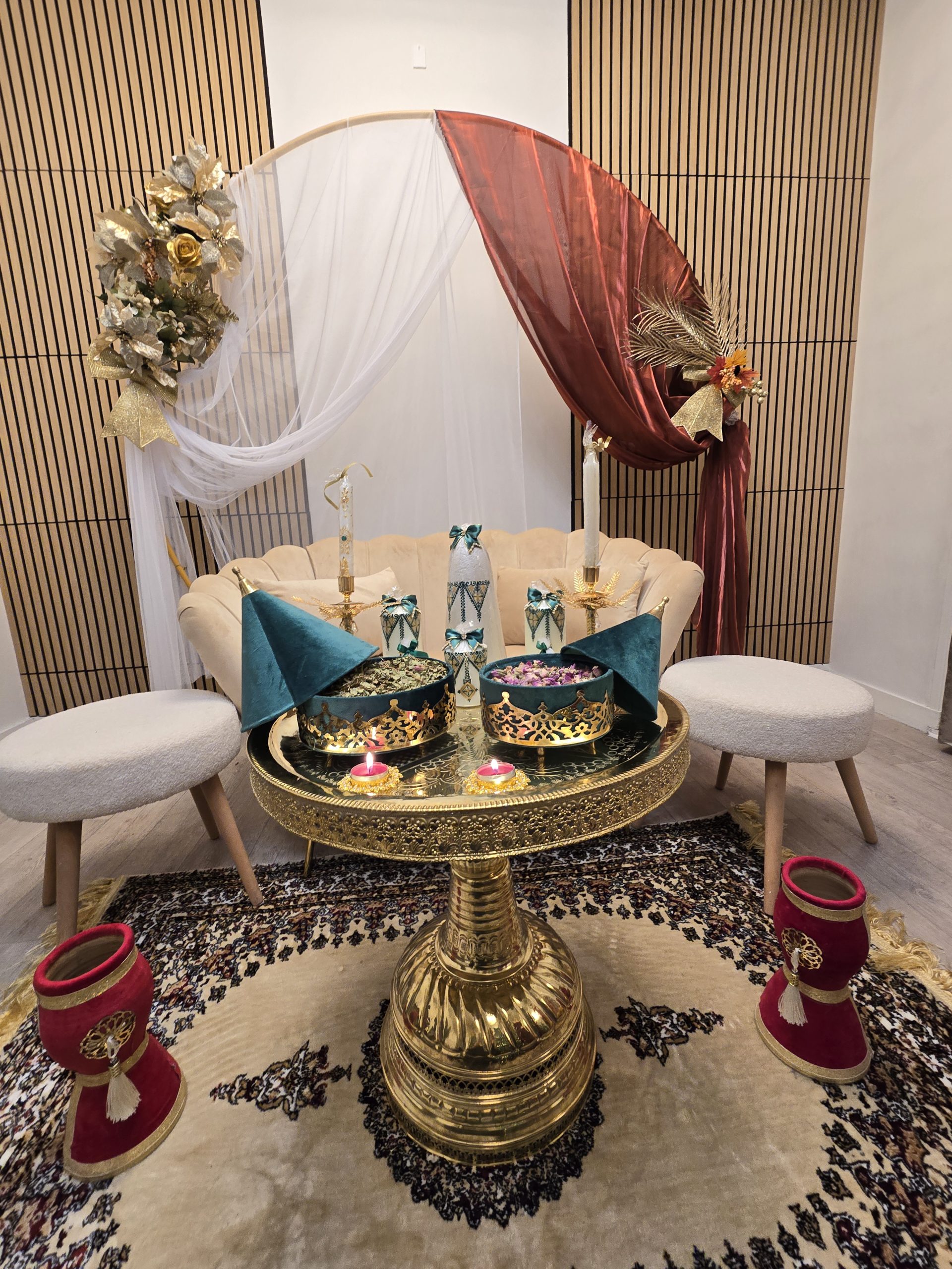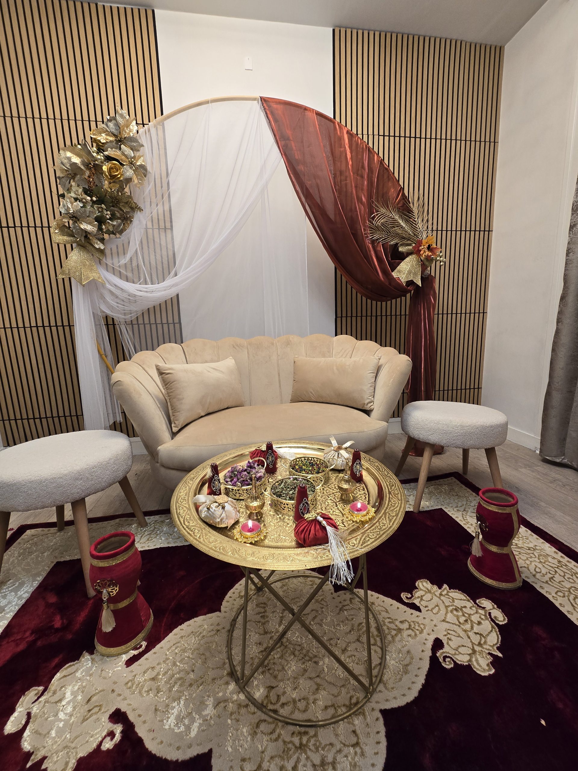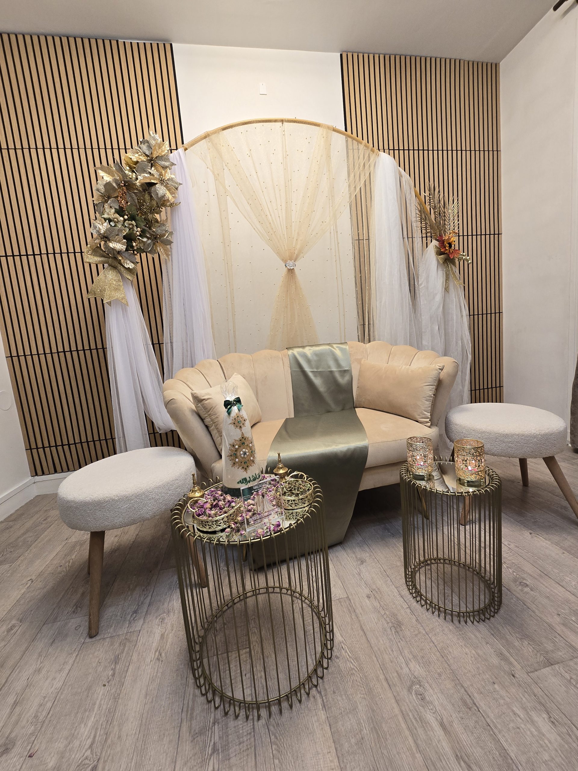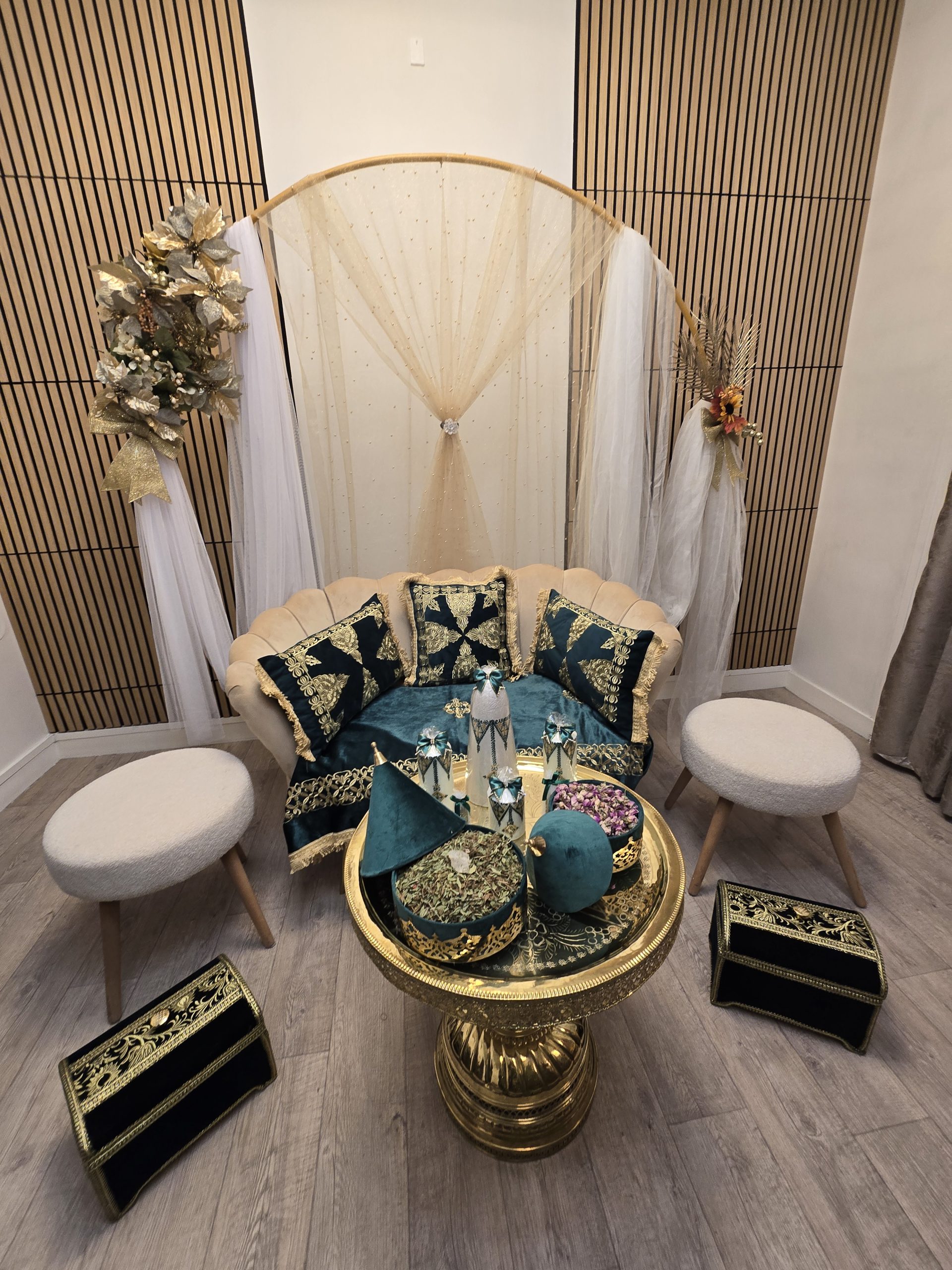 Idéal pour les mariages marocains traditionnels, ce coin est spécialement pensé pour offrir un cadre harmonieux et luxueux aux mariés, tout en mettant en valeur les rituels et les échanges symboliques. Il constitue également un décor parfait pour des photos de mariage inoubliables.