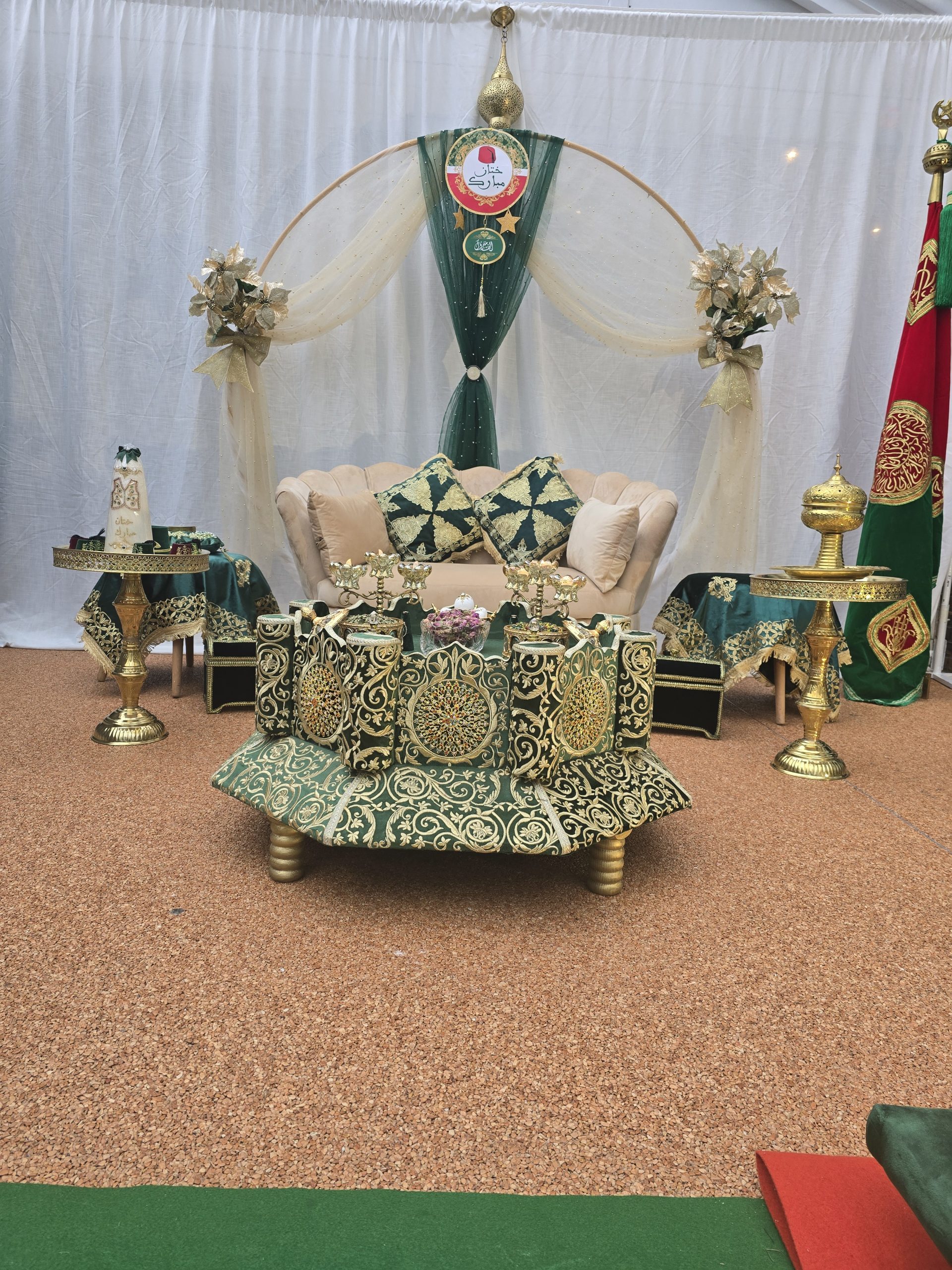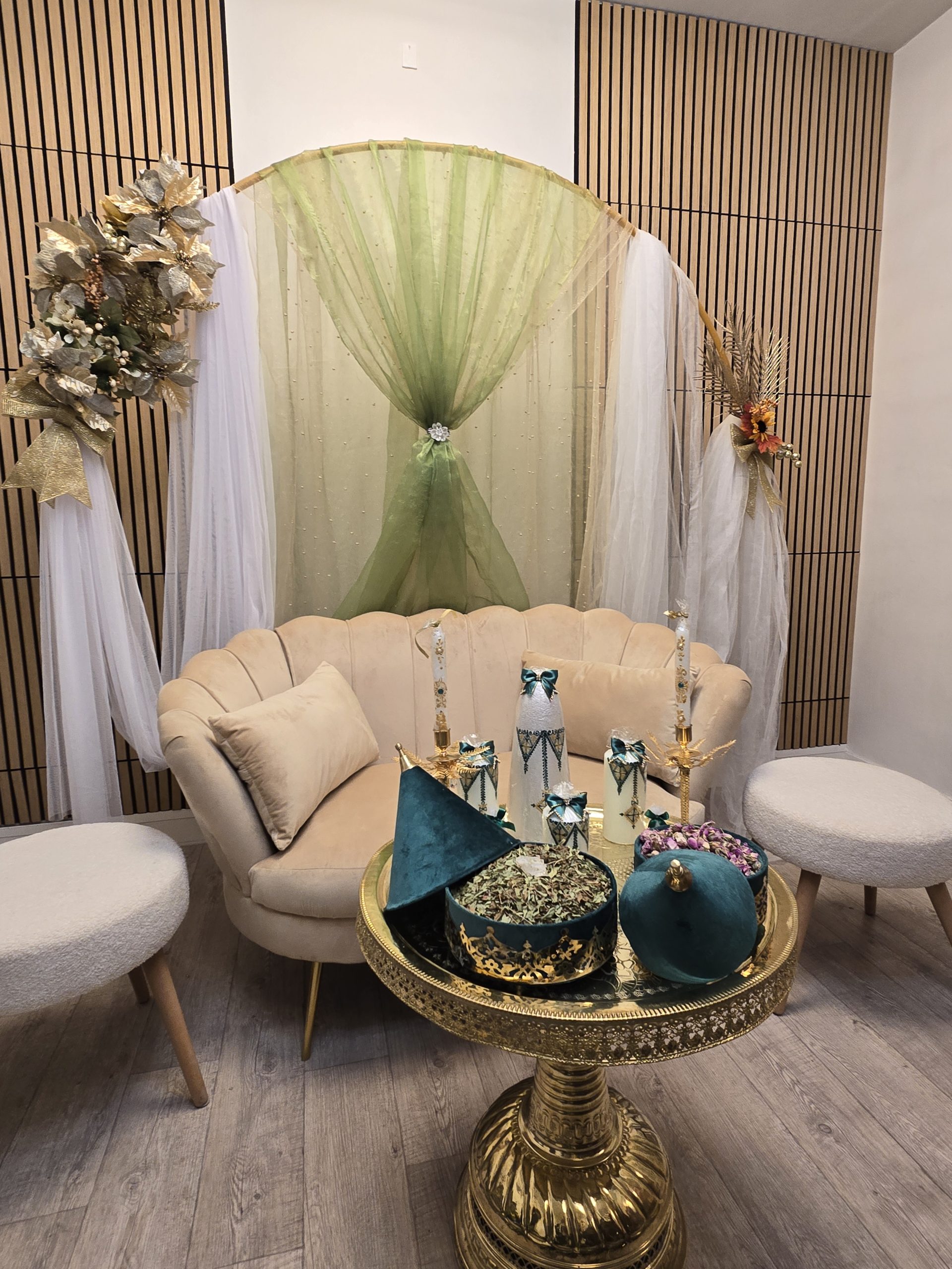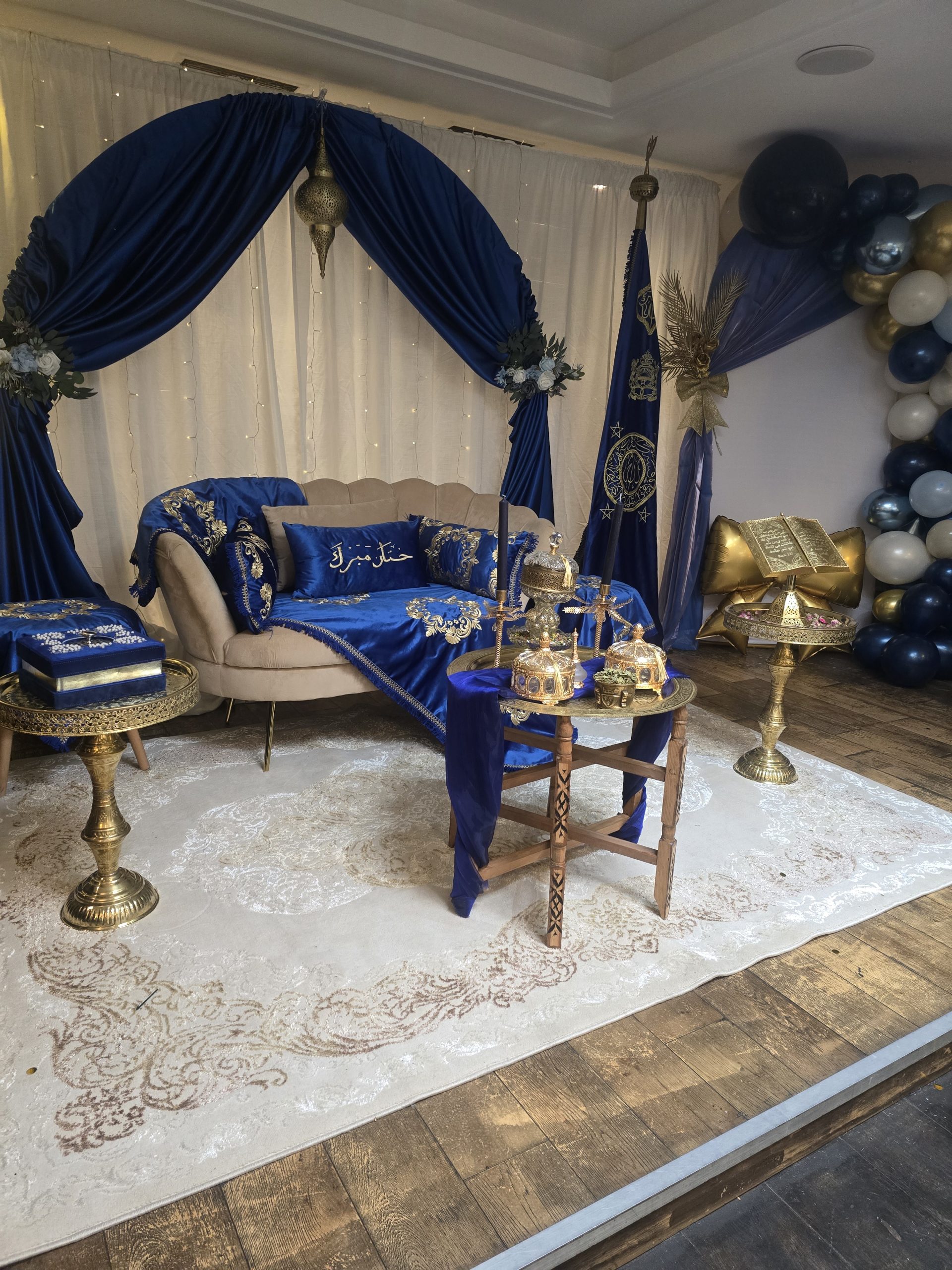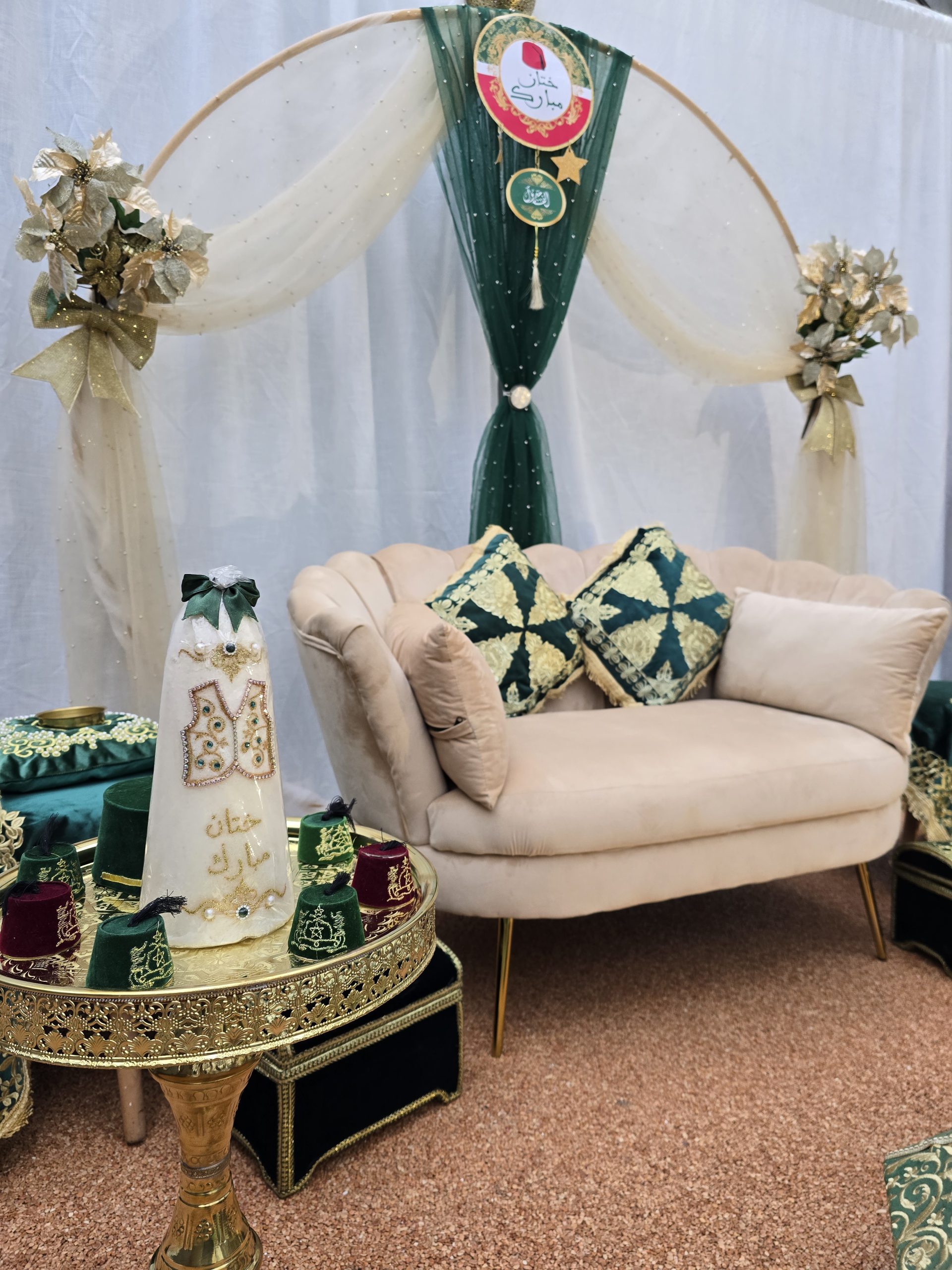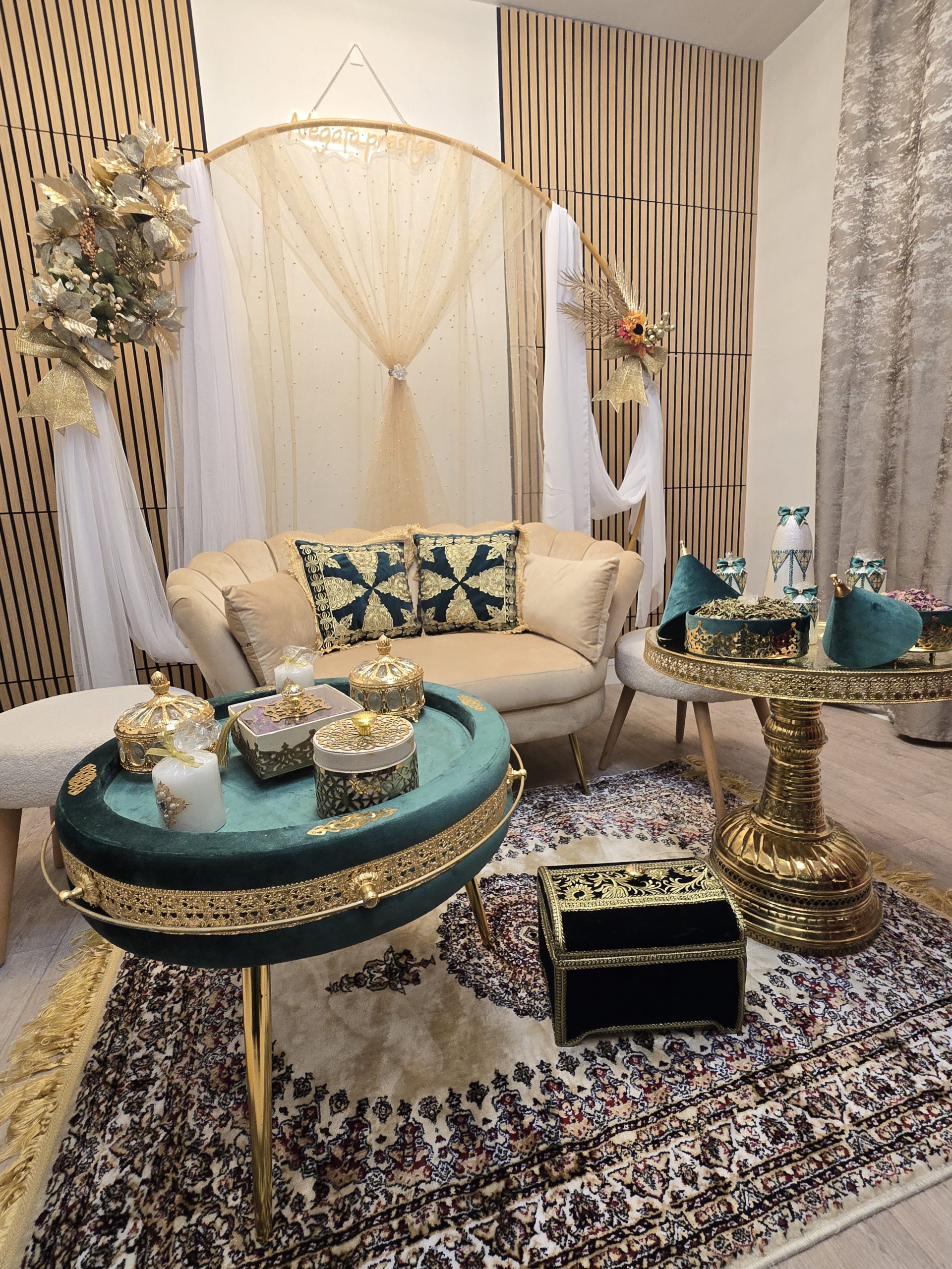 Idéal pour les mariages marocains traditionnels, ce coin est spécialement pensé pour offrir un cadre harmonieux et luxueux aux mariés, tout en mettant en valeur les rituels et les échanges symboliques. Il constitue également un décor parfait pour des photos de mariage inoubliables.