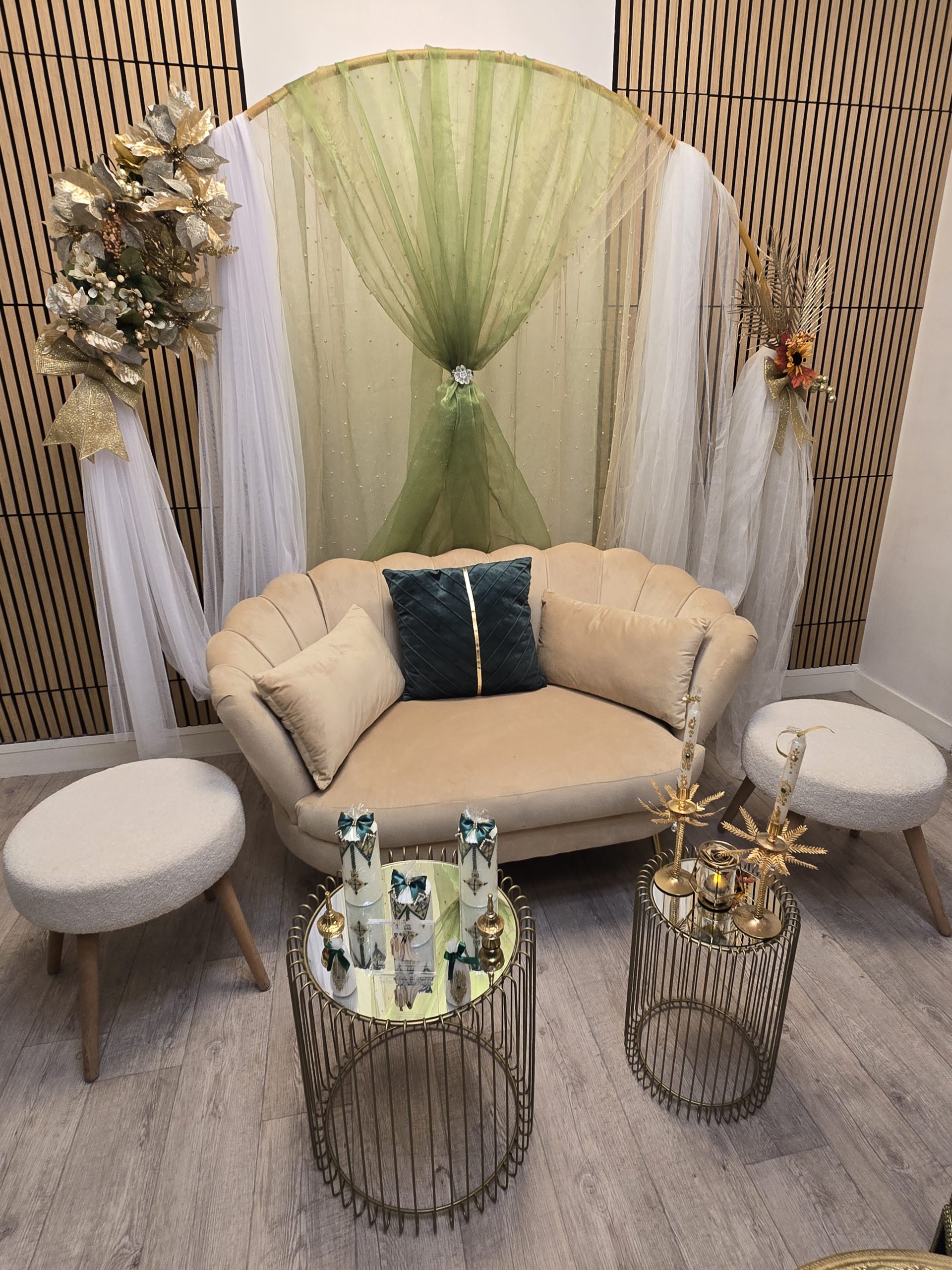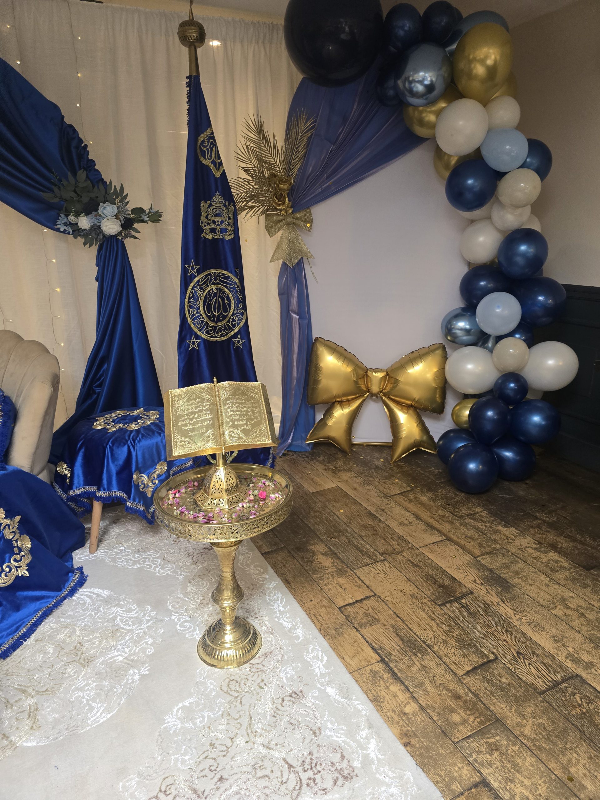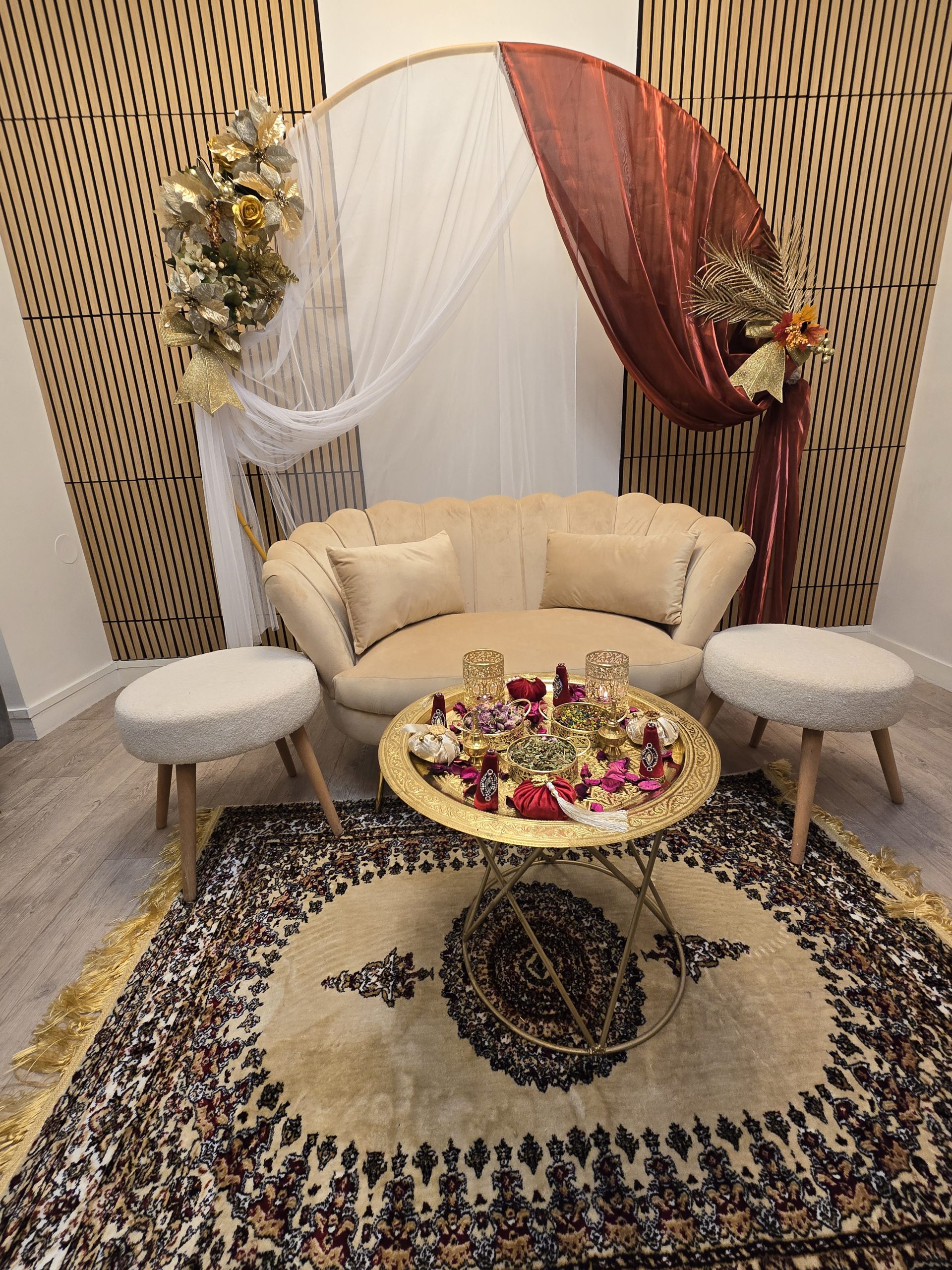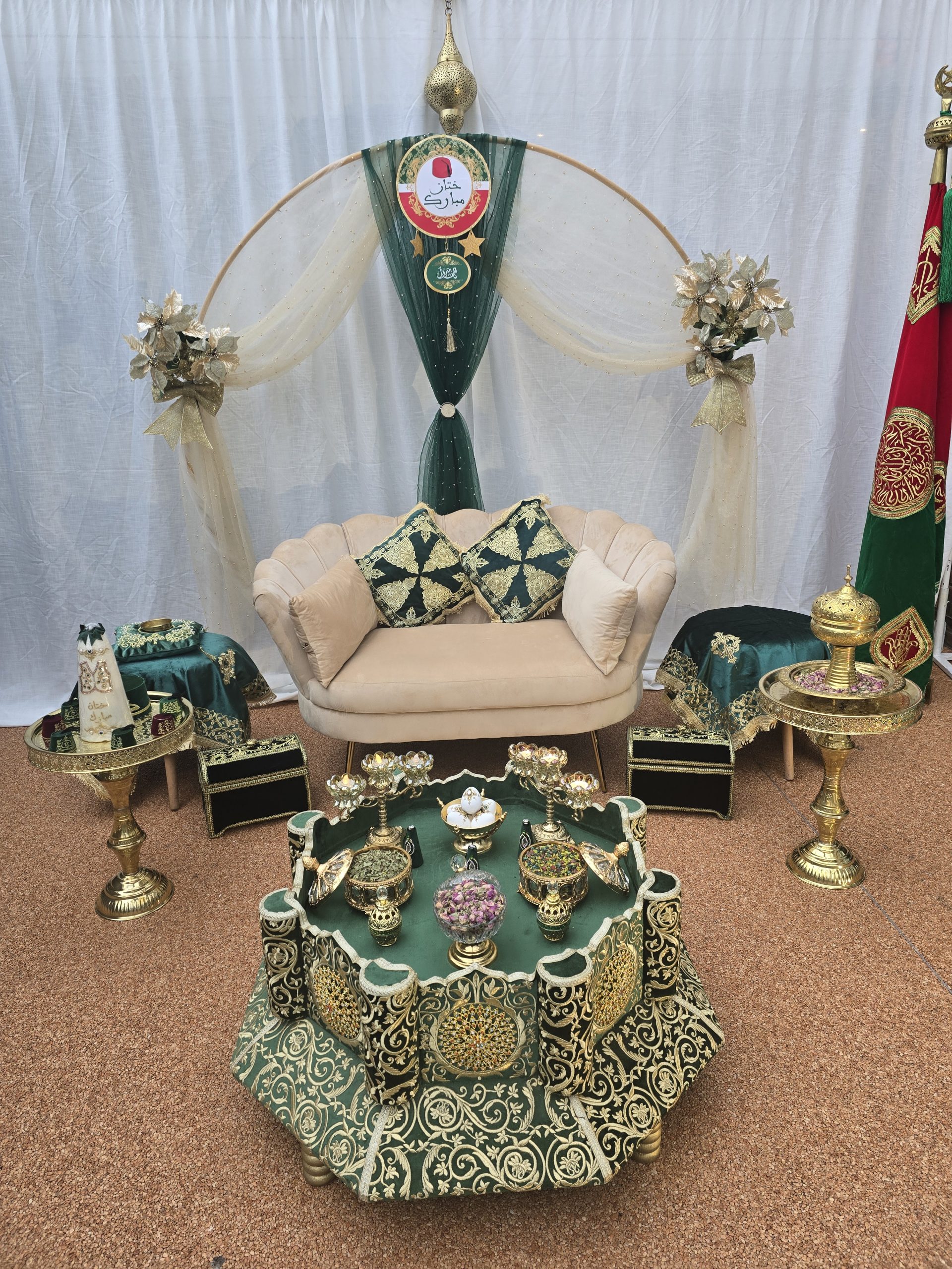 Idéal pour les mariages marocains traditionnels, ce coin est spécialement pensé pour offrir un cadre harmonieux et luxueux aux mariés, tout en mettant en valeur les rituels et les échanges symboliques. Il constitue également un décor parfait pour des photos de mariage inoubliables.