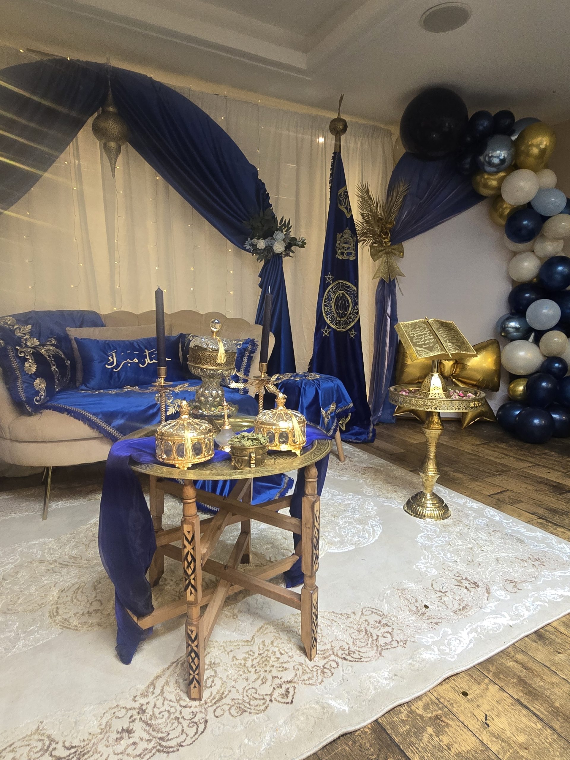 Réalisé avec un grand soin du détail, ce coin marié se compose d’un trône majestueux, de tables artisanales finement travaillées, de lanternes traditionnelles, de tapis marocains et de tissus élégants aux finitions dorées. Chaque élément est choisi pour créer une ambiance chaleureuse, royale et authentique, fidèle aux traditions marocaines.